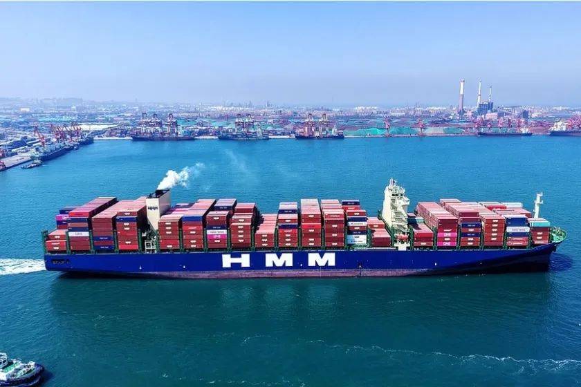 山东港口青岛港,装载外贸集装箱的货轮驶出港口皇冠登3管理出租 。(图源:视觉中国)