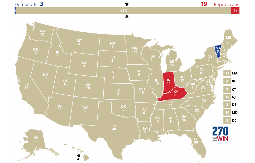 美国大选最新计票结果显示,共和党候选人、前总统特朗普赢得了肯塔基州(8张)和印第安纳州(11张),民主党候选人、副总统哈里斯赢得佛蒙特州(3张),目前两人19票对3票皇冠信用网登1。美国总统选举实行选举人团制的间接选举制度,候选人需要获得至少270张选举人票才能当选。