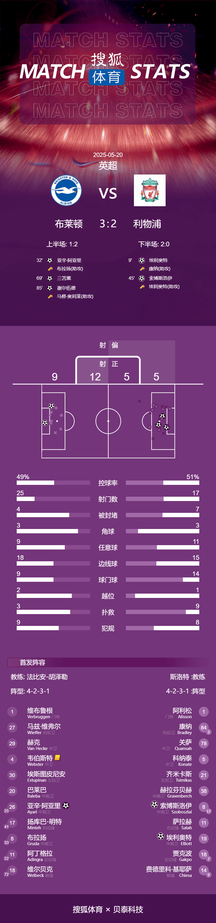 布莱顿(4-2-3-1):1-维尔布鲁根/27-魏费尔、29-范黑克、4-韦伯斯特、30-埃斯图皮尼安/20-巴莱巴、26-阿亚里(74分钟 25-迭戈-戈麦斯)/17-明特(84分钟 72-霍威尔)、8-格鲁达(73分钟 33-奥赖利)、11-阿丁格拉(65分钟 22-三苫薰)/18-维尔贝克(84分钟 41-欣谢尔伍德)
